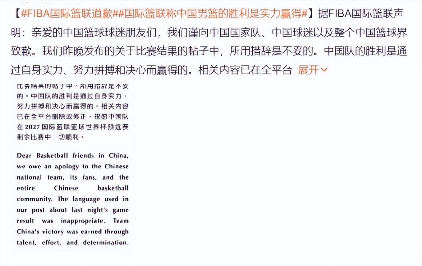 可这份道歉里,从头到尾没有一句提及裁判的问题,没有一句反思吹罚的不公,甚至连一句对中国男篮的真切歉意都没有。