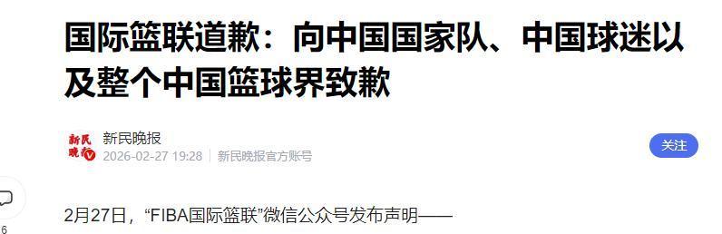 新民晚报2026-02-27——国际篮联道歉:向中国国家队、中国球迷以及整个中国篮球界致歉
